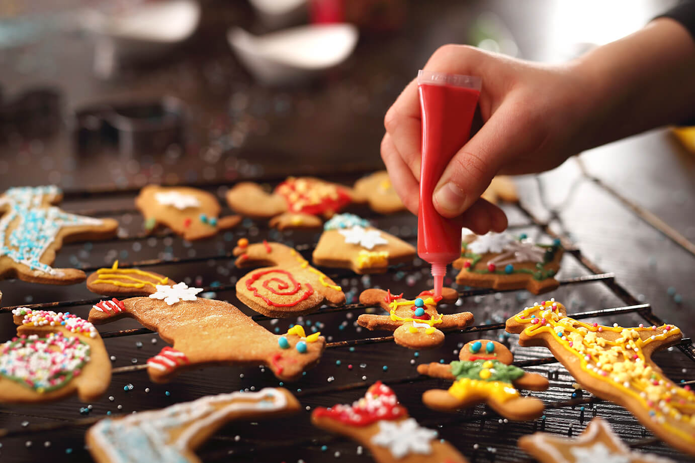 Podczas warsztatów, z ciasta opartego na tradycyjnej recepturze dzieci wykrawają pierniczki, które po upieczeniu własnoręcznie lukrują i ozdabiają wg. własnej inwencji.